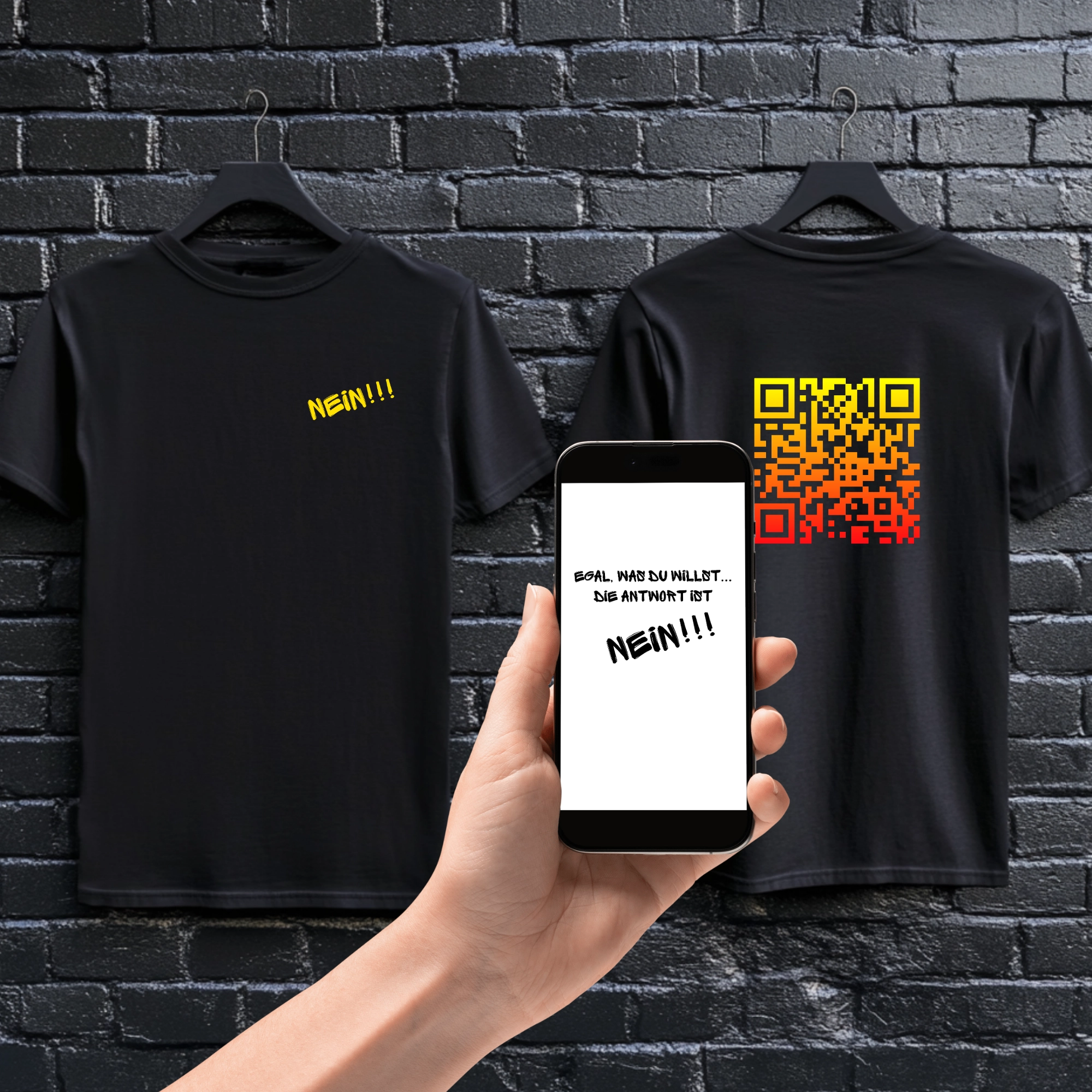 QR-Code-T-Shirt Unisex „Nein, Egal was du willst"QR-Code-T-Shirt Unisex „Nein, Egal was du willst”