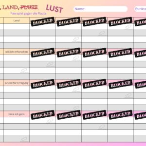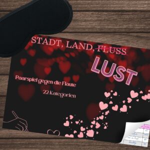 Bringt frischen Schwung in eure Beziehung und lasst die Funken sprühen! Mit “Stadt, Land, Lust” erwartet euch ein prickelndes Spiel für zwei, das spielerisch Intimität, Kommunikation und Abenteuer in den Mittelpunkt stellt. Perfekt für Paare, die eine kleine Sexflaute überwinden möchten oder einfach Lust auf etwas Neues haben.