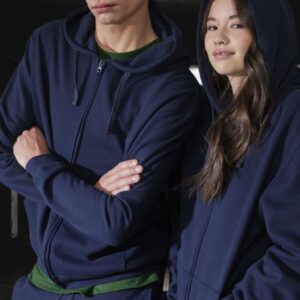 Unisex- Design: Klassischer Schnitt, Kapuze mit Single Jersey Futter, 1×1 Rippstrick an Ärmel und Bund mit Elasthan, durchgehender Reißverschluss, Kängurutaschen, versetzte Nähte auf der Schulter, sitzt locker, lässig, alltagsfähig