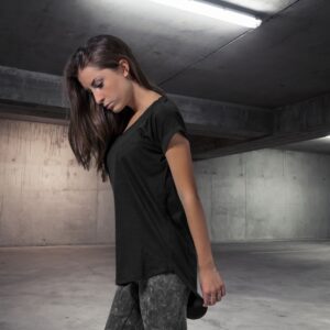 - Damen-Design: Länger geschnitten, großzügiger Rundhalsausschnitt, überschnittene Ärmel mit Umschlag, Doppelnähte am Saum, abgerundetes verlängertes Rückenteil